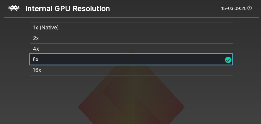 “Internal GPU Resolution”を調整して解像度を上げる。どれくらい上げるのが一番良いかはデバイスの性能とゲームと好み次第なので色々試してみてください。以下はおおまかな目安です。